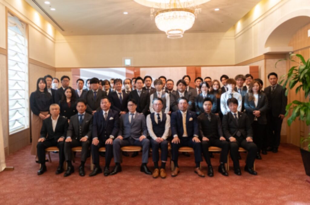最後は、全社員と外部関係者の集合写真。スーツ姿で整列しながらも、表情にはそれぞれの覚悟と笑顔が見えました。この写真は、私たちが共に目指す未来へのスタートの証です。